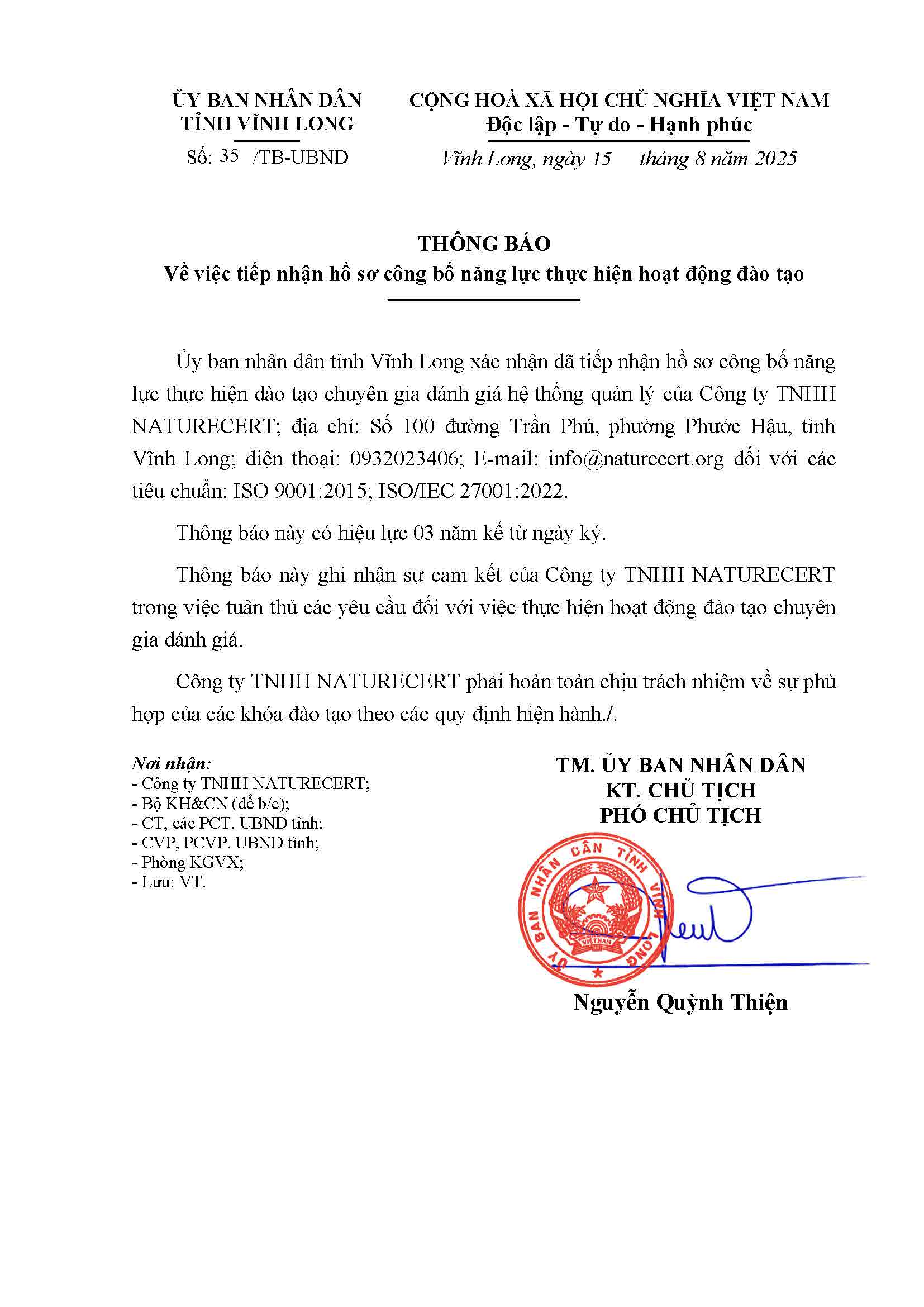 Bạn đang tìm kiếm một khóa học chuyên sâu để trở thành Chuyên gia Đánh giá Trưởng ISO 9001:2015? Công ty TNHH NATURECERT tự hào giới thiệu chương trình đào tạo chuyên biệt, được Ủy ban Nhân dân tỉnh Vĩnh Long xác nhận đủ năng lực thực hiện hoạt động đào tạo theo thông báo số 35/TB-UBND. Khóa học của chúng tôi được thiết kế để trang bị cho bạn đầy đủ kiến thức, kỹ năng và năng lực cần thiết để dẫn dắt các cuộc đánh giá hệ thống quản lý chất lượng một cách hiệu quả.